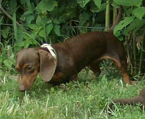 Willow is chocolate and tan. She loves to bury bones. She's also my resident entertainer. She smiles for anyone who asks her to..and everyone asks her to do it when they come to visit! She's retiring in 2014. She was recently bred and if she's pregnant it will be her last litter. She is NOT being rehomed