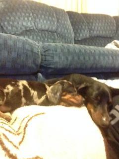 Gosh is it ever cold out!! I'll bet your house is worse than mine since you are in the country!! Be careful! Keep your phone with you in case you fall outside!! The girls get along great! They love each other already. It is too cold outside for Callie to potty all the time, but she is pretty good. She knows "potty" already! They race around together all the time. I say they are really short greyhounds!! LOL! They snuggle together, too. Callie is wonderful. Thanks again. By the way, compliments from our vet...again. They say you keep very good records.(not to mention awesome puppies). I am going to try to attach a picture of the girls. No promises...you know I am not computer literate!